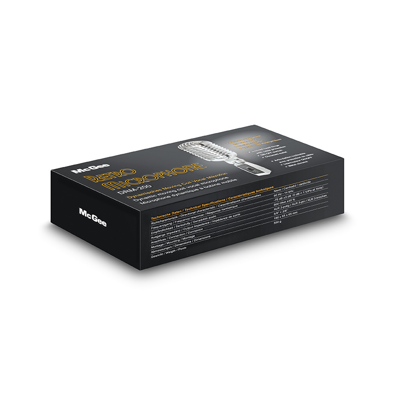 Cool jaren 50 retro design! Of het nu voor op het podium of in de studio is en natuurlijk voor hoge eisen aan het bureau, met de McGee DRM-200 zit je zowel qua geluid als uiterlijk aan de goede kant. Dankzij de evenwichtige en aanwezige klank, stabiele cardioïde karakteristiek, laag close-up effect, fijne resolutie van de hoge tonen en evenwichtige klank in het middenbereik is de DRM-200 niet alleen een visueel maar ook een sonisch hoogtepunt.